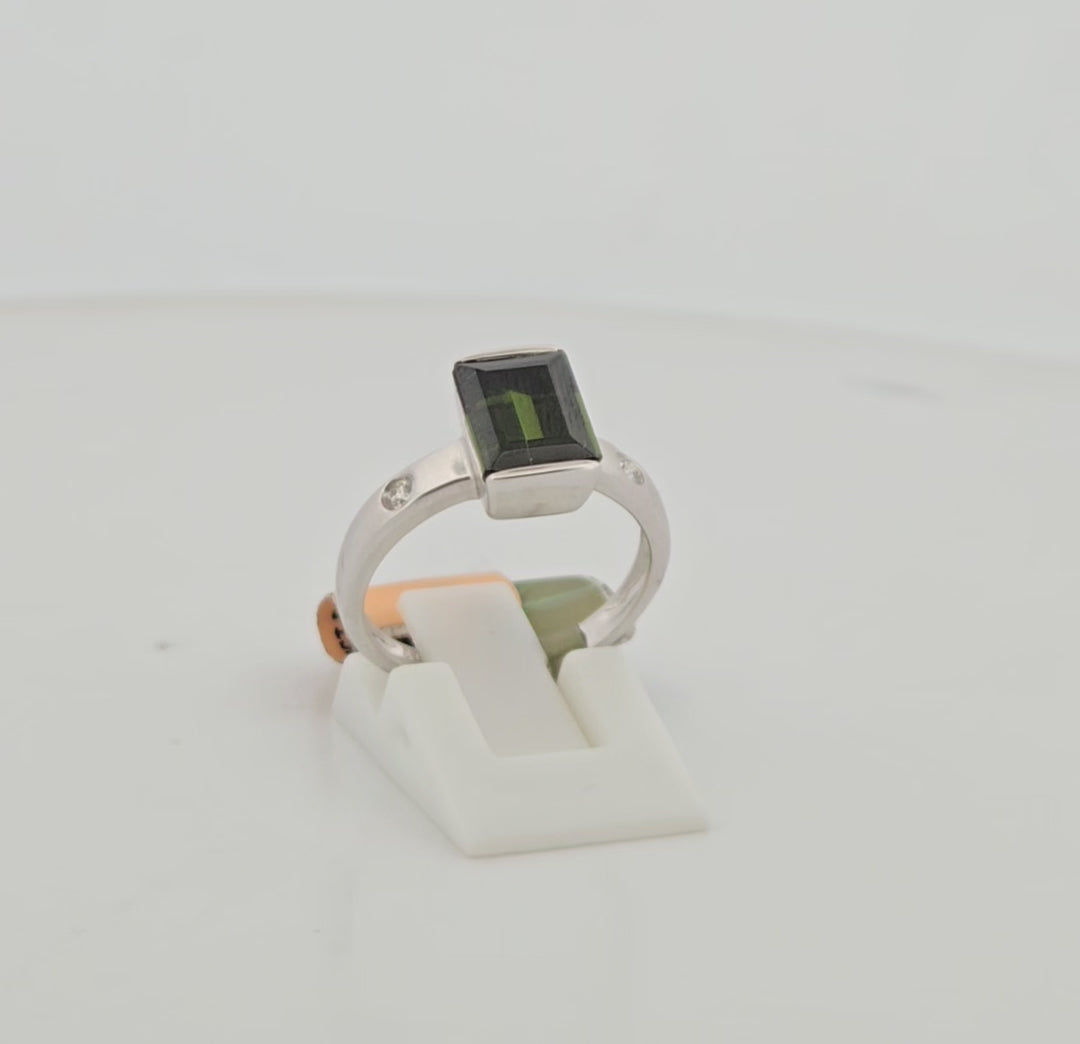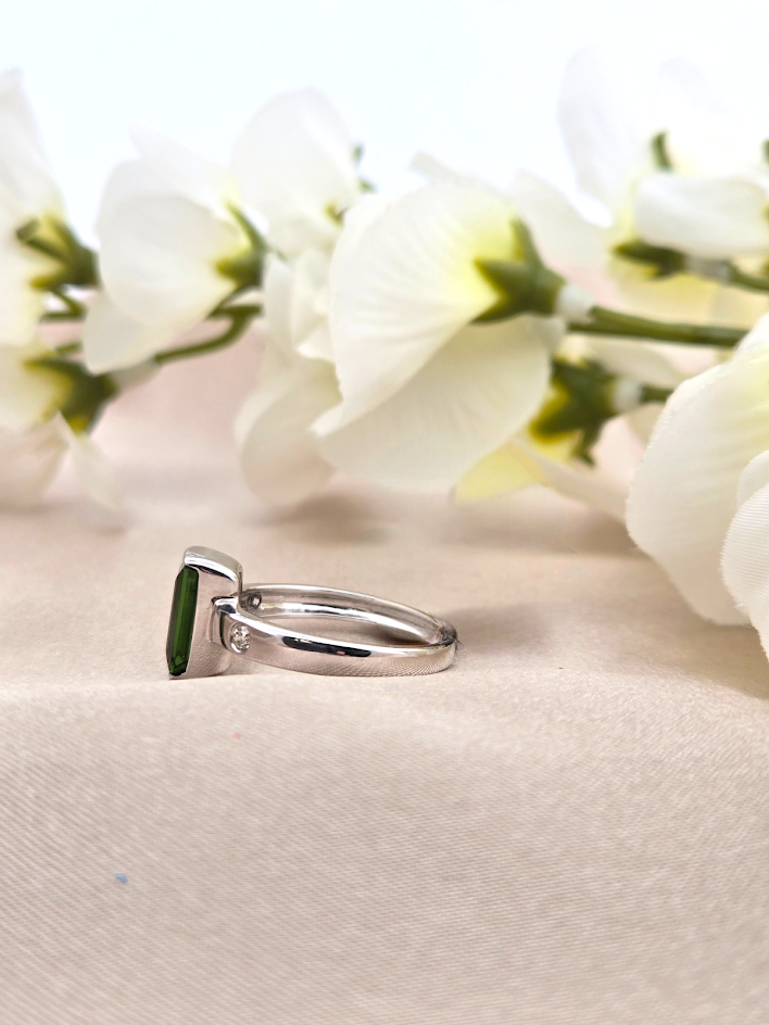 Aeris | 18k White Gold | Emerald Tourmaline & Diamond | Ring | Elevate your everyday elegance with the Aeris ring, a stunning 18k white gold design that captures light and attention. This sophisticated piece features a breathtaking 2.73-carat emerald tourmaline as its centerpiece, complemented by two sparkling round diamonds totaling 0.07 carats. The cool brilliance of white gold provides the perfect backdrop for the tourmaline's rich, mesmerizing hue. Expertly crafted for size 6.5, this ring seamlessly transitions from day to night, making it an investment piece you'll treasure for years to come.