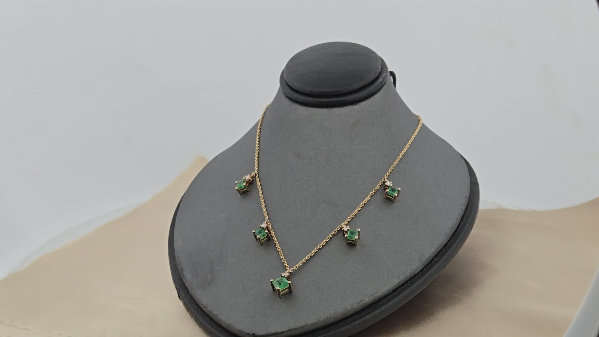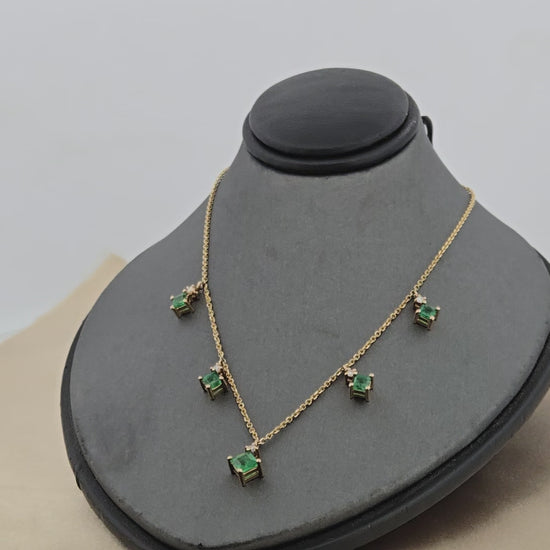 Aerith | 14k Yellow Gold | Emerald & Diamond | Necklace | Elevate your everyday elegance with the Aerith necklace, a stunning 14k yellow gold piece that captures timeless sophistication. This 16-inch necklace features five radiant 1.40-carat princess-cut emeralds, their lush green hues symbolizing grace and renewal, complemented by five brilliant 0.10-carat round diamonds that add a touch of sparkle. The warm glow of yellow gold perfectly enhances the emeralds' rich color, creating a harmonious blend of luxury and wearability. Whether layered with other pieces or worn as a statement on its own, this necklace brings refined beauty to any occasion—from casual gatherings to special celebrations.
