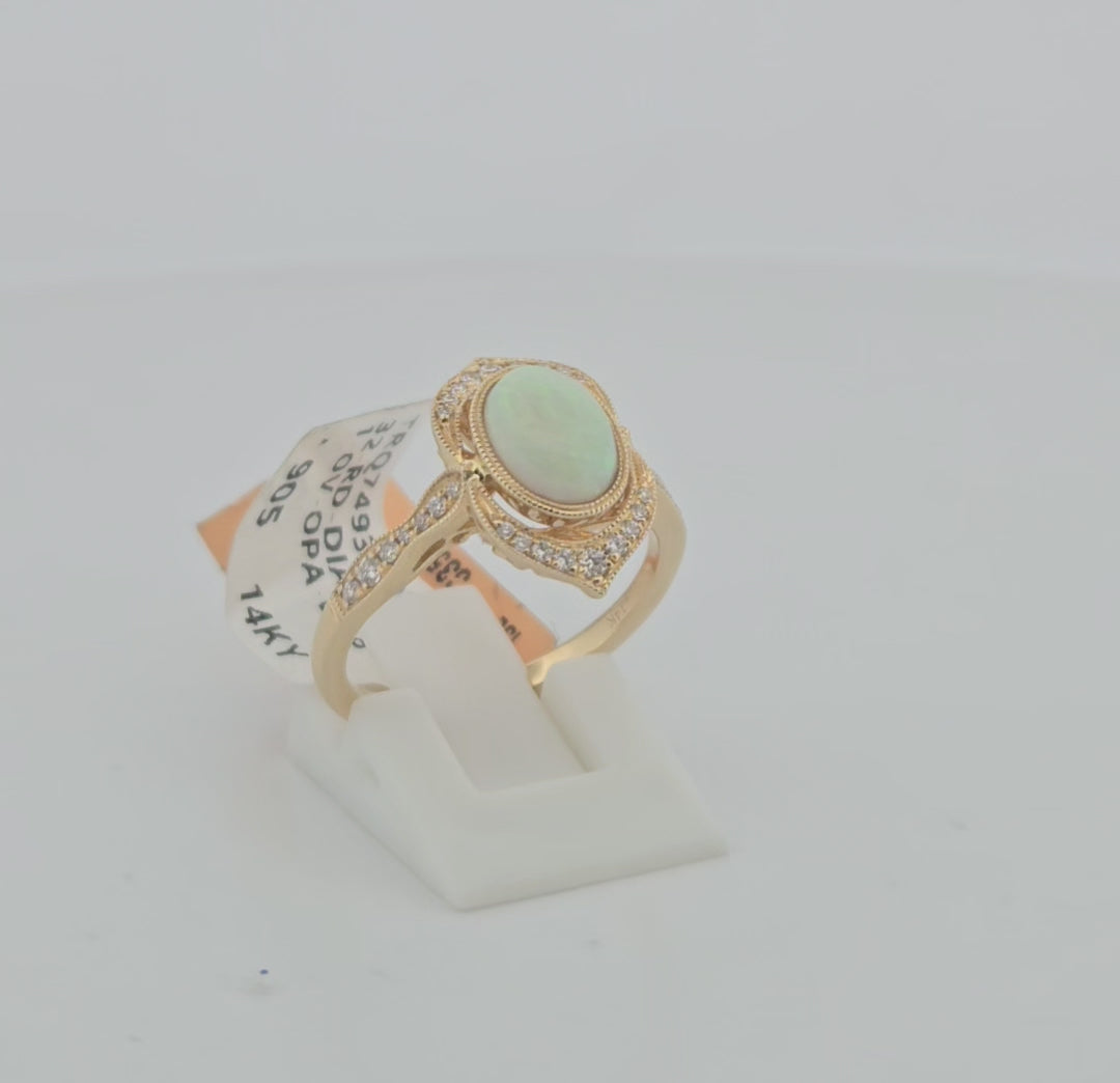 Aveline | 14K Yellow Gold | Opal & Natural Diamond | Ring | The Aveline ring captures timeless elegance with its stunning opal centerpiece, showcasing nature's most mesmerizing play of color. Set in lustrous 14K yellow gold, this piece combines the warm glow of precious metal with the ethereal beauty of a .88 carat opal, accented by .19 carats of sparkling natural diamonds. Each facet catches the light differently, creating a dynamic sparkle that draws the eye. Perfect for those who appreciate distinctive gemstones and refined craftsmanship, the Aveline makes an unforgettable statement on any occasion—whether as a cherished personal treasure or a meaningful gift for someone special.