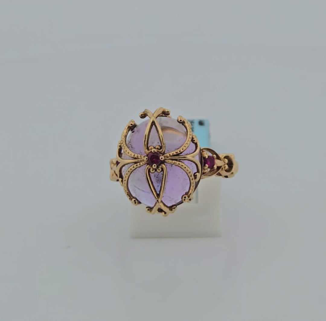 Estelle | 18k Yellow Gold | Amethyst | Ruby | Ring | Elevate your jewelry collection with this stunning yellow 18 karat fashion ring, a true testament to timeless elegance. Featuring a magnificent 8.25-carat amethyst as the centerpiece, complemented by three brilliant round created rubies, this piece delivers sophisticated color and sparkle. Expertly crafted in genuine yellow gold, the Estella ring combines luxury with wearability, perfect for making a statement at any occasion. Size 6.5 ensures a comfortable fit. This exquisite combination of precious metal and vibrant gemstones creates an heirloom-quality piece that captures attention and admiration.