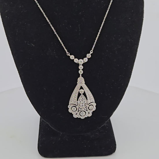 Fiora | 10k White Gold Diamond Pendant Necklace | .88 CTW Natural Round Diamonds | 1 3/4" Sparkling Drop Pendant | Adjustable 16"-18" Fine Gold Chain | Add effortless elegance to your jewelry collection with this stunning 10k white gold diamond pendant necklace from Mountain Song Jewelers . Featuring a graceful 1 3/4" drop pendant encrusted with .88 CTW of natural round diamonds, this luminous piece hangs from an adjustable 16"-18" white gold chain. Designed for both timeless glamour and everyday sophistication, it’s the perfect accent for any occasion.