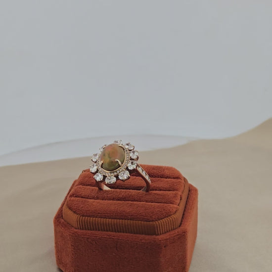 Holly | 14k Yellow Gold | Opal & Lab Diamond | Ring | Radiant elegance meets modern sophistication in this stunning 14k yellow gold ring. Featuring a captivating 2.15-carat opal as the centerpiece, surrounded by 56 lab-created diamonds totaling 1.83 carats, this piece delivers luxury without compromise. The warm glow of yellow gold beautifully complements the opal's mesmerizing play of color, while the brilliant diamond halo amplifies its sparkle. Perfect for those who appreciate distinctive style and ethical craftsmanship, this size 7.25 ring makes an unforgettable statement for any occasion.