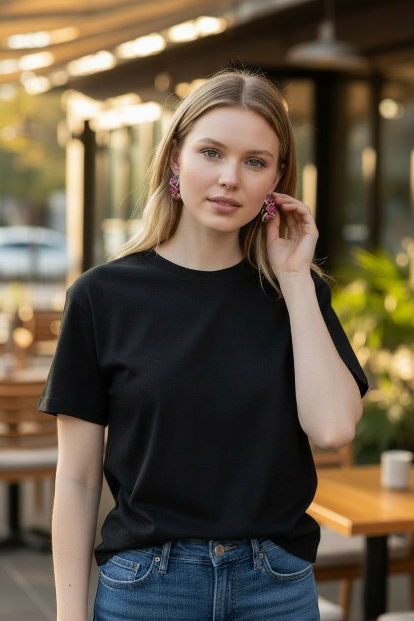 Jania | 14k Rose Gold | Pink Sapphire | Natural White & Black Diamonds | Earrings | Elevate your jewelry collection with the Jania earrings, a stunning blend of luxury and sophistication. Crafted in 14k rose gold, these exquisite studs feature 16 pink sapphires (3.89 carats) in various cuts, complemented by 80 brilliant round natural diamonds (0.95 carats) and striking natural black diamonds (1.43 carats). The harmonious interplay of warm rose gold, romantic pink tones, and dramatic black creates an unforgettable statement piece perfect for both special occasions and refined everyday elegance. A timeless investment in beauty and craftsmanship.