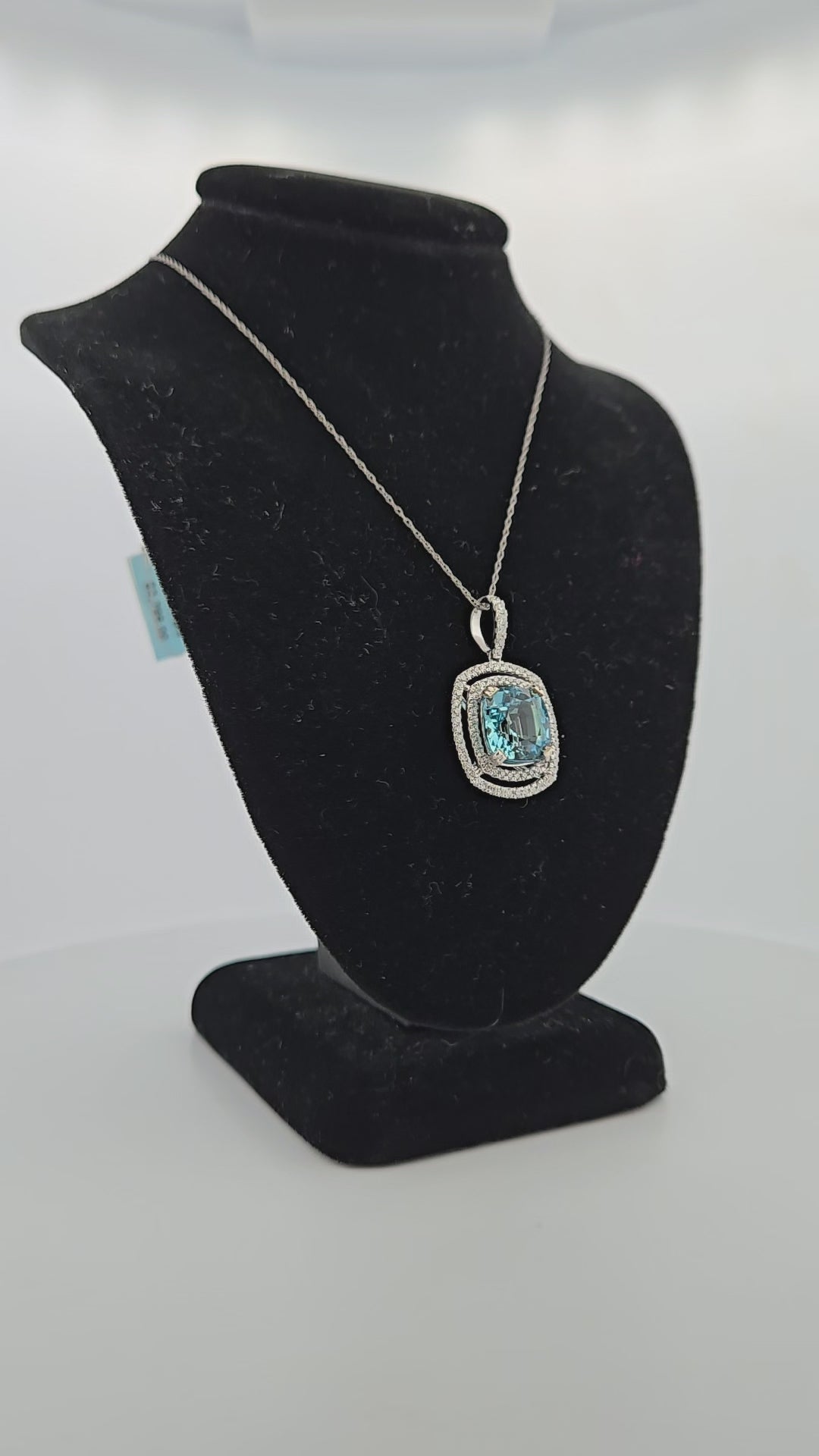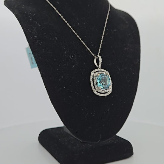 Features: Crafted in 14K white gold for a classic, luxurious look 3.00 CT cushion-cut aquamarine with a captivating blue hue 1.0 CTW natural diamonds add brilliance and elegance to the pendant.