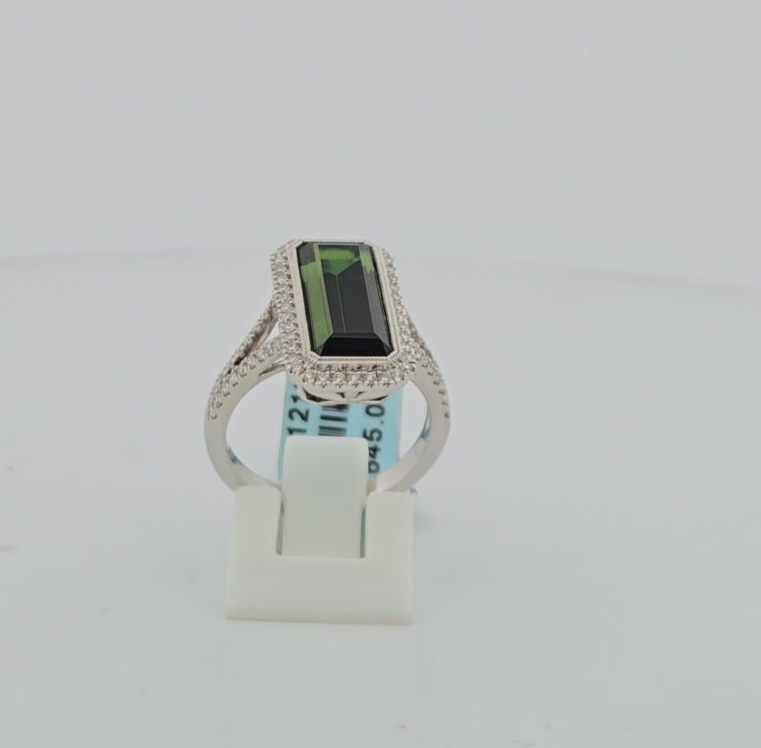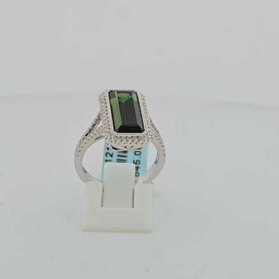 Marah | 14k White Gold | Green Tourmaline and Natural Diamond | Ring | Elevate your jewelry collection with this stunning 14k white gold ring, a masterpiece of elegance and sophistication. Featuring a breathtaking 5.24-carat emerald-cut green tourmaline as the centerpiece, this ring is surrounded by 76 brilliant natural round diamonds totaling 0.43 carats, creating a luminous halo that amplifies the stone's natural beauty. The crisp white gold setting enhances the vibrant green hue while providing timeless durability. Perfect for those who appreciate distinctive gemstones and refined craftsmanship, this size 6.75 ring makes an unforgettable statement piece for special occasions or everyday luxury.