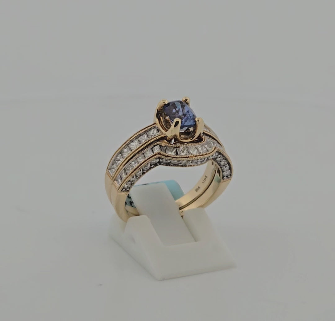 Marisol | 14K Yellow Gold Wedding Set | 1.25 CT Tanzanite Center | 1.52 CTW Natural Diamond Accents | Round & Princess Cut | Size 7 | This exquisite 14K yellow gold wedding set features a mesmerizing 1.25 CT tanzanite center stone, elegantly surrounded by 1.52 CTW natural diamonds in a mix of round and princess cuts. The rich blue-purple tanzanite is beautifully complemented by the warm yellow gold setting, creating a timeless and sophisticated bridal look.