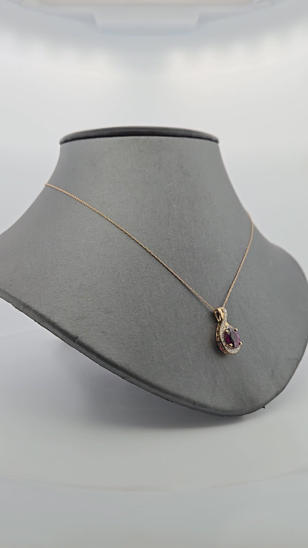 Samantha | 10k Yellow Gold | Garnet | Diamond | Necklace | Elevate your everyday elegance with the Samantha necklace, a stunning 10k yellow gold piece that captures timeless sophistication. This exquisite design features a striking oval purple garnet as its centerpiece, complemented by sparkling round diamonds that dance with light. The warm glow of yellow gold creates a luxurious backdrop that enhances both the rich purple hue and brilliant diamond sparkle. Perfect for layering or wearing solo, this versatile necklace transitions seamlessly from day to night, making it an investment piece you'll treasure for years to come.