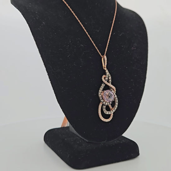 Savannah | 14k Rose Gold | Amethyst & Natural Diamond | Necklace | Discover timeless elegance with the Savannah necklace, a stunning blend of luxury and natural beauty. Crafted in 14k rose gold, this piece features a captivating amethyst centerpiece complemented by sparkling natural diamonds that catch the light with every movement. The warm rose gold setting enhances the rich purple tones of the amethyst, creating a sophisticated look that transitions effortlessly from day to evening wear. Perfect for those who appreciate fine jewelry with meaningful gemstone qualities, the Savannah necklace is an investment piece that celebrates your refined taste and individual style.
