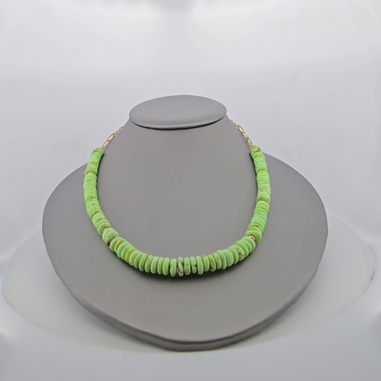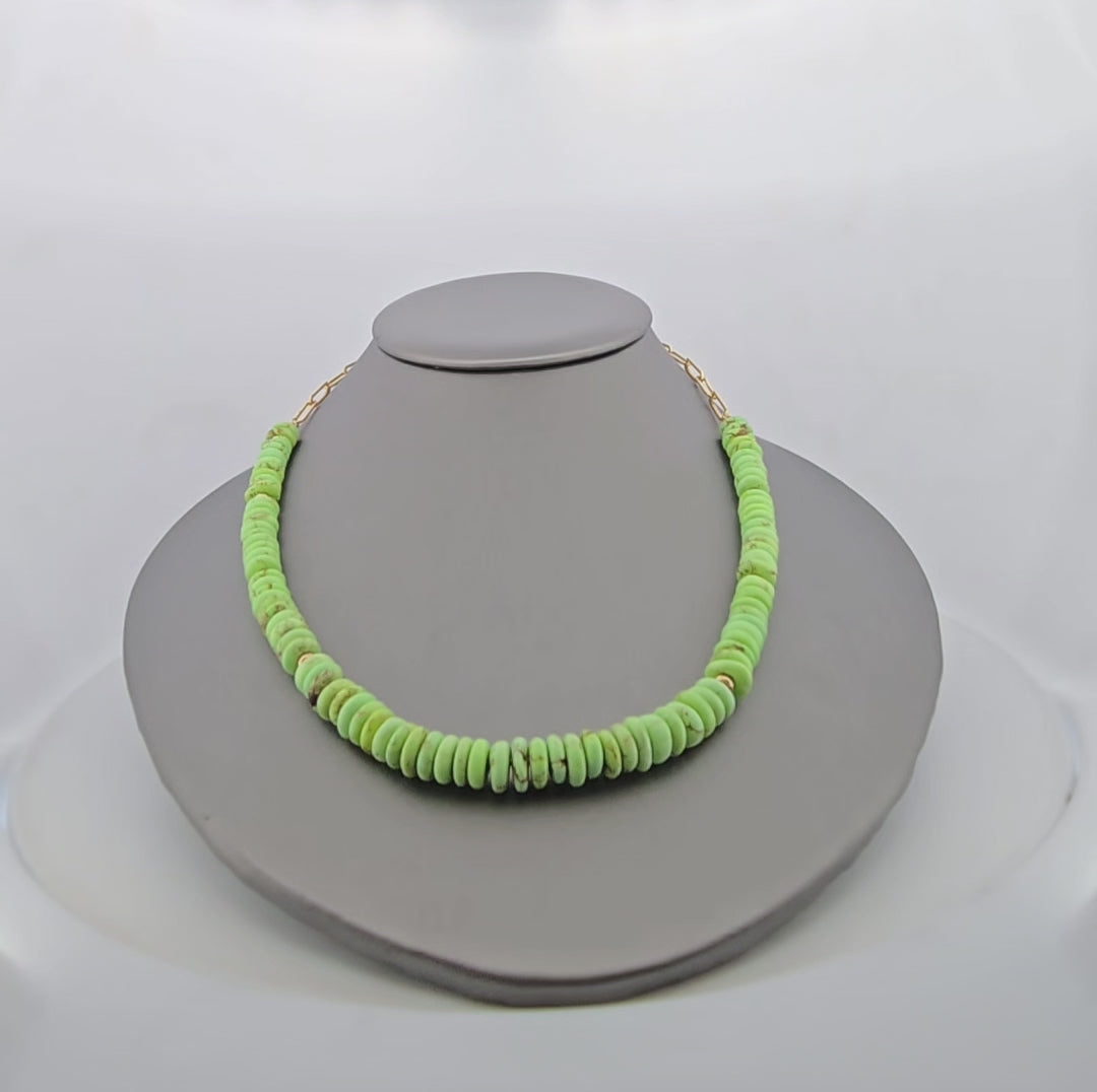 Sora | 14k Yellow Gold | Gaspiat Turquoise | Necklace | Elevate your everyday elegance with this stunning 14k yellow gold necklace, a masterpiece that celebrates the natural beauty of Gaspiat turquoise. Featuring an enchanting mix of varied geometric shapes, each turquoise stone showcases the distinctive veining and rich blue-green hues that make Gaspiat turquoise so coveted by jewelry connoisseurs. At 19 inches, this versatile length sits perfectly at the collarbone, offering a refined statement that transitions seamlessly from casual to formal occasions. The warm glow of 14k yellow gold complements the turquoise's vibrant character, creating a piece that feels both timeless and contemporary. Perfect for those who appreciate artisanal craftsmanship and genuine gemstone beauty.