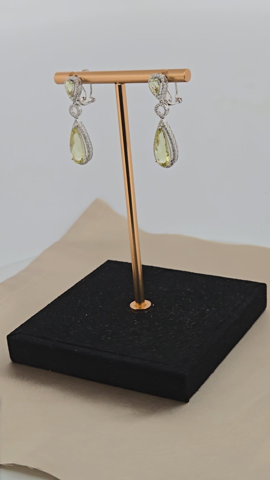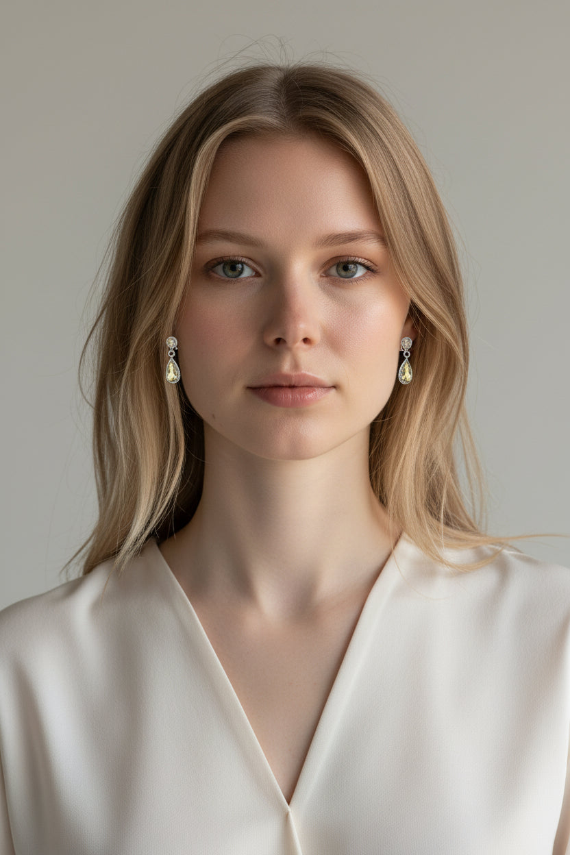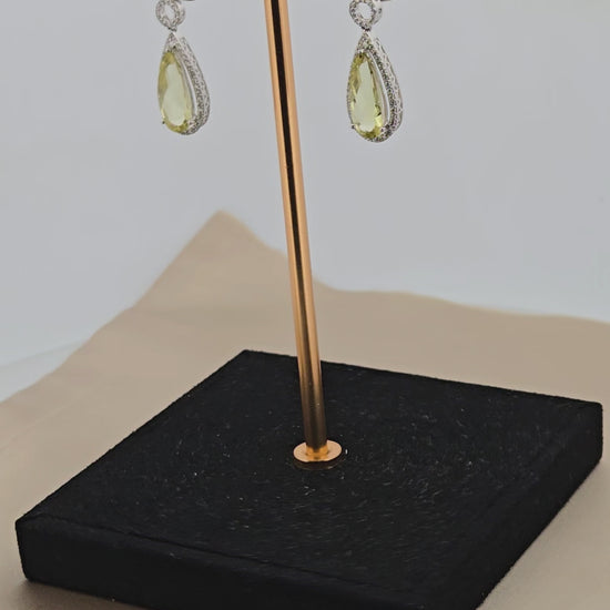 Sorriel | 14k White Gold | Green Quartz & Natural Diamond | Earrings | Make a statement with these exquisite Sorriel earrings, featuring luminous pear-shaped yellowish green quartz (4.60 carats) suspended from pristine 14k white gold. Delicate round diamonds (0.51 carats) frame each stone, creating a sophisticated interplay of color and sparkle. The graceful drop silhouette flatters any face shape and transitions seamlessly from boardroom to evening events. These gemstone earrings offer the perfect balance of bold color and refined craftsmanship for the discerning jewelry collector.